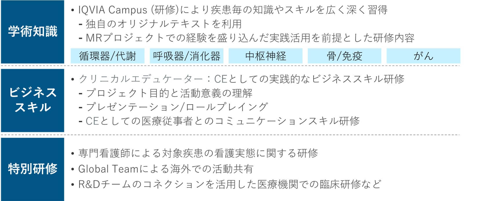 独自の内容・資材を用いた「学術知識」「ビジネススキル」「特別研修」の各トレーニングメニューを実施することで、クニリカルエデュケーター(CE)としての活躍を支援しております