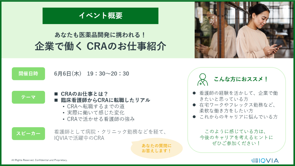 本イベントでは、臨床看護師からCRAに転職して活躍している方のリアルな体験談をお届けします。転職のきっかけや苦労したこと、転職をして叶えたことなど、実際に働いているCRAからリアルな声が聞けるなかなかない機会です。仕事内容や働く上で経験を活かせたことなどについてお話しますので、CRAって何?という方も、ぜひのぞいてみてください。「実際に働いている方から話を聞けてイメージが湧いた!」など、いつも好評をいただいています。また、人事担当者からは求められる人材像などについてもご紹介します。